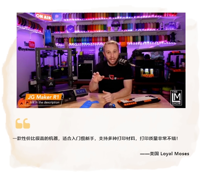 最近幾個月,極光創(chuàng)新R1憑借其極具人性化的簡單設計和高精度的打印質量,被海外市場一致認為是最具性價比的入門級3D打印機,受到眾多消費者的喜愛,許多權威人士和社媒博主都對這款3D打印機給予了高度評價,認為它是入門級用戶的理想選擇。